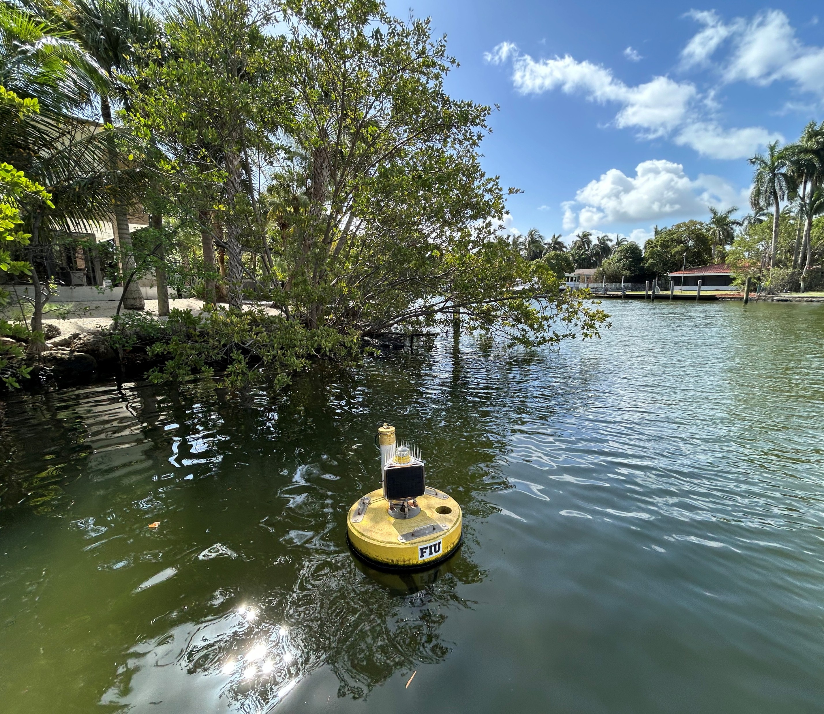 After deploying our first research buoy in 2018 at Haulover Inlet, we later placed another buoy nearby to draw comparisons in the surrounding water quality and flow data. This second site was located in shallower waters close to a mangrove forest near FIU's Biscayna Bay Campus. In addition to providing data comparisons, this buoy also gave us some baseline information on a mangrove ecosystem.